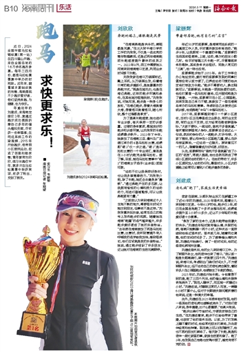 为了提高长跑速度,她也进行专业训练,每天保持一定的训练量。过硬的身体素质,椰城良好的跑步和训练环境,让刘欣欣的长跑成绩稳步跃升。2023年下半年,她参加了在海南三亚、儋州及广东湛江举办的4场马拉松比赛,成绩距“破3”仅一步之遥。“破3”是马拉松比赛的一个专业词汇,意思是在3小时内跑完全程马拉松。据了解,目前,能在马拉松赛事中“破3”的海南女子选手(业余组)屈指可数。