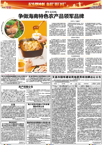 “今年参加了海南首届好物节线上活动,我们的文昌鸡产品很受欢迎,销量也明显提升!”日前,在潭牛文昌鸡公司仓库内,海南(潭牛)文昌鸡股份有限公司(以下简称潭牛文昌鸡公司)负责人一边忙着备货一边说。为了抢滩市场,潭牛文昌鸡公司结合好物节“海南风物异中华”主题精心打造文昌鸡美味体验活动,这不仅是潭牛文昌鸡公司以海南文化赋能特色美食“出圈”的一次生动实践,也是其抢开局冲刺“开门红”的有力举措。作为国家高新技术企业和海南省农业产业化重点龙头企业,潭牛文昌鸡公司争创海南农产品领军品牌,近年来已构建起本地文昌鸡品种的核心竞争力,坚持以市场需求为导向、品牌建设为抓手,充分结合海南特色产业优势,在夯实种业发展根基的基础上,以新技术满足新需求,以新思路开辟新出路,为我省文昌鸡产业的升级与发展提供可参考、可借鉴、可复制的示范样板。