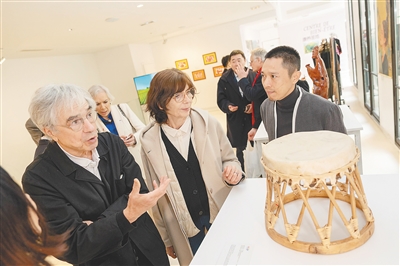 今年是中法文化旅游年。“你好!中国 阳光海南”国际影像展暨海南旅游文化推介活动近日在法国巴黎举行,300多件独具海南风情的影像作品和非遗工艺品亮相巴黎。图为参会嘉宾在品鉴海南昌江牛皮凳展品。