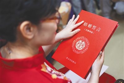 为了让这场特殊的婚姻登记有爱无“碍”,在了解了新人视力情况后,北京市西城区民政局婚姻登记服务中心的工作人员与中国盲文出版社合作,专门制作了盲文版、大字版无障碍格式的结婚登记告知单和结婚誓言,这也是我国首次为视障人士提供结婚登记无障碍格式文件。