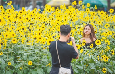 3月14日,海口万绿园盛开的向日葵引来市民游客拍照留念。据了解,万绿园种植的向日葵约有3500株,向日葵种苗于去年12月种下,现在正处于盛花期,花期持续到3月底。
