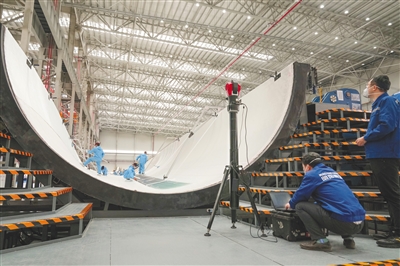 该基地还采用模块化制造和高效组装设备相结合,大大降低叶片制造难度。梁利清介绍,常规叶片采用一体灌注成型,但随着叶片增大,铺层褶皱、灌注包围等风险会成倍增加。他们将叶片结构进行分解,按功能进行区分,将一体成型难度大、风险高的模块提前制作,“这样有助于提高制造效率和产品质量。”