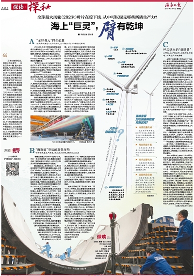 “看着全球最大风轮叶片在家乡下线,作为一名见证者和参与者,真真切切感到自豪。”曾回斌是东方本地人,去年5月入职东方明阳新能源高端装备产业基地。