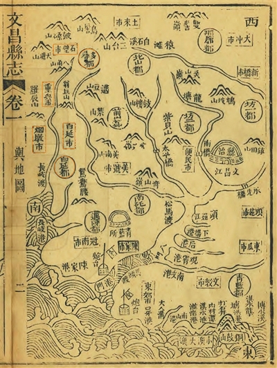 清代咸丰《文昌县志》舆图上的“白延都”“白延市”等地名。 资料图