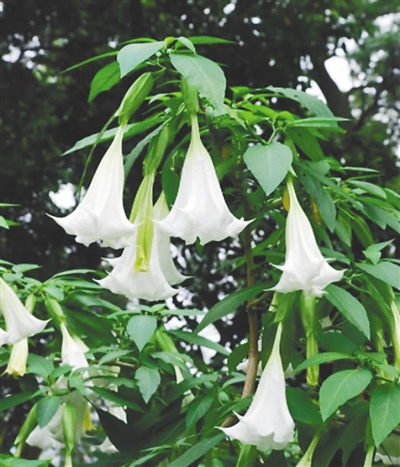 曼陀罗,又名醉心花、狗核桃,全株有毒,其主要有毒成分为莨菪碱、阿托品及东莨菪碱(曼陀罗提取物)等生物碱,以果实特别是种子毒性最大、嫩叶次之、干叶的毒性比鲜叶小。毒性主要是生物碱,在误食其果实后,会出现腺体分泌较少、口干、吞咽困难、瞳孔散大、抽搐、发烧、意识障碍、呼吸浅慢共济失调等症状,严重时可因延髓麻痹而死亡。