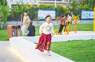 3月16日,在海口市琼山区新大洲大道旁的一处口袋公园里,不少家长带着孩子来欢度周末时光。