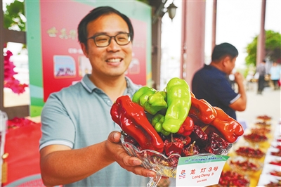 3月20日,一家辣椒展商展示自家的辣椒品种。