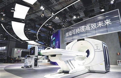 美国GE公司在进博会展台展出的大型医疗设备。新华社发