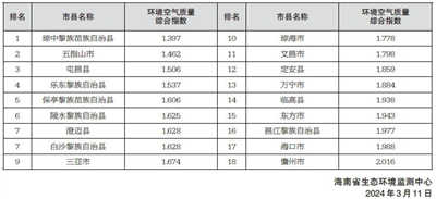 环境空气质量排名靠前的市县分别是琼中黎族苗族自治县、五指山市和屯昌县,排名靠后的市县分别是儋州市、海口市和昌江黎族自治县。2024年2月全省18个市县环境空气质量排名如右: