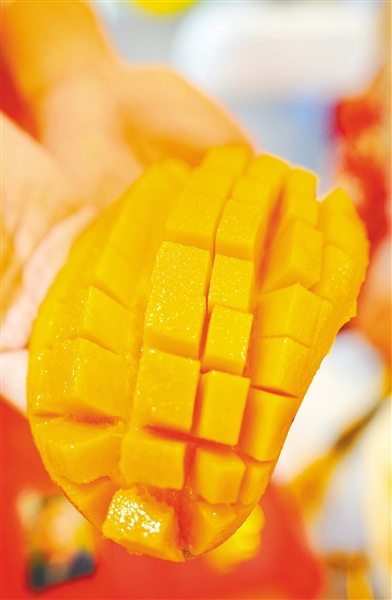 “这芒果软滑又香甜,从果品色泽到口感品质都很不错!”展位上,一盘盘金煌芒切块摆放,浓郁的果香扑鼻而来,不少群众、客商驻足试吃后赞不绝口,这是海南十三义实业有限公司带来的“生态芒果”。
