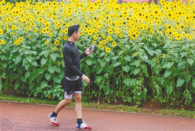 在海口万绿园,向日葵盛开,吸引路过的市民观赏。本报记者 李天平 摄