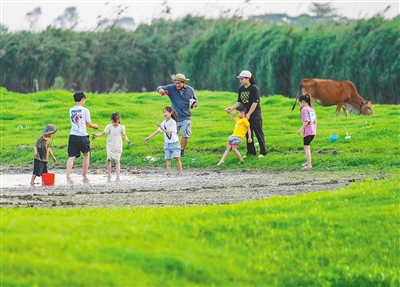 在海口琼山区龙塘镇三桥村,市民游客体验抓鱼乐趣。本报记者 李天平 摄
