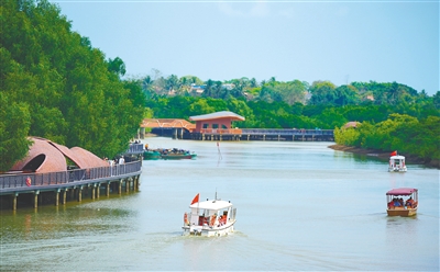 在海口东寨港红树林旅游区,游客乘船游览红树林美景。本报记者 张茂 摄
