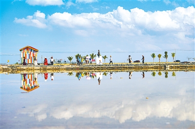 在乐东黎族自治县莺歌海盐场,游人感受盐田风光。本报记者 王程龙 摄