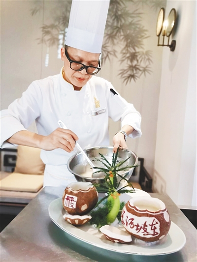 从消博会上的印象椰子盅、南渡江孔雀开屏,到冬交会上的东坡绵蹄、博鳌亚洲论坛年会上的东坡酒煮生蚝,这些彰显海南地域文化特色的菜肴,成为宾客们了解海南的窗口。“让来自世界各地的嘉宾从美食里‘吃’出海南文化味,是我们一直在做的事情。”黄鼎夷说。
