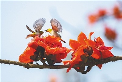 鸟儿在采食木棉花花蜜。本版图片均为资料图