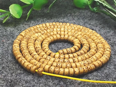 根据形状、颜色、密度、质地等特征,“星月菩提子”又大致分为4种类型——“元宝籽”是最常见的一种,形状呈椭圆形或圆形,表面有明显的凸起和凹陷,颜色以黄色为主,质地坚硬,密度较大;“金蟾籽”形状呈圆形或近圆形,表面光滑无纹路,以绿黄色为主,质地柔软,密度较小;“云盖籽”形状呈扁圆形或椭圆形,表面有细小的纹路,颜色以黄色或黄褐色为主,质地较为坚硬,密度适中;“摩尼籽”是一种比较特殊的品种,其形状呈扁圆形或圆形,表面有较大的纹路和凹陷,以白色或浅黄色为主。