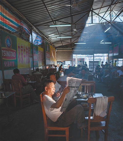 喝老爸茶看报纸。 2011/8/3 博爱南路 本版图片均由孙诺提供