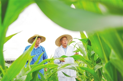 ③三亚南繁基地内,育种专家查看授粉期玉米材料的生长情况。本报记者 王程龙 摄
