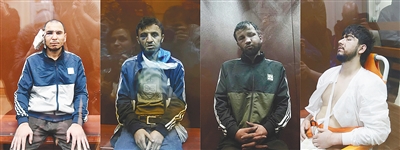 这张3月24日的拼版照片显示的是,4名嫌疑人坐在俄罗斯莫斯科巴斯曼区法院被告席内。新华社发