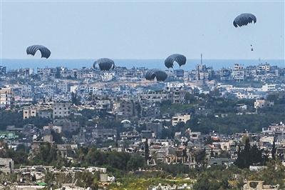 图为3月24日,飞机空投人道主义援助物资进入加沙地带。新华社/美联