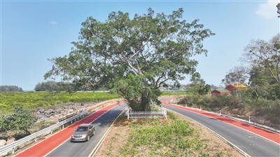 近日,群众驾车驶过海南环岛旅游公路儋州市光村镇新丰村段,与一棵20米高的“高龄”榕树擦肩而过。这棵枝繁叶茂的古榕树,曾让环岛旅游公路在建设过程中主动“绕行”,在当地形成了一道独特风景。本报记者 陈元才 摄