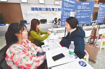 在湖南湘江新区零工市场,求职者(右)向工作人员咨询岗位信息。新华社记者 陈泽国 摄