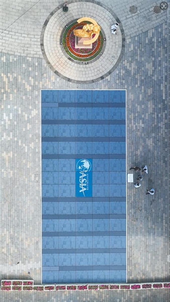 图❼ 博鳌近零碳示范区新闻中心北侧的光伏地砖。该产品集成了防滑钢化加厚的大面积碲化镉发电玻璃和控制器,不仅发电能力稳定,还能抵抗3吨/平方米荷载的压力。