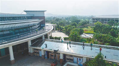 图❶ 俯瞰博鳌近零碳示范区,场馆屋顶铺满了光伏板。总面积190.15公顷的博鳌近零碳示范区,目前已完成所有改造建设任务,实现近零碳排放,改造后建筑运行能耗整体下降比例近50%,岛内交通工具能耗下降比例达80%。