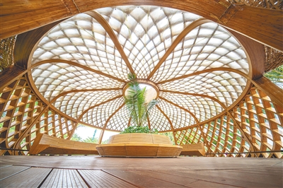 图❹ 博鳌近零碳示范区椰林聚落驿站。该驿站应用高性能、环保的竹钢等自然材料作为骨架,建筑形态可以促进空气流通与降温,顶部覆盖1518块光伏板,收集转化太阳能供给园林照明,降低使用能耗与碳排放。