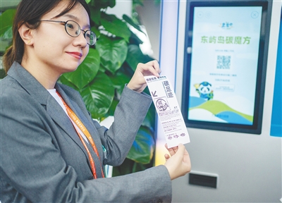 图❻ 在博鳌近零碳示范区,与会人员展示体验回收废弃物设备“碳魔方”后获得的“碳足迹”小票。年会期间,嘉宾将回收废弃物,如塑料水瓶、易拉罐等放在“碳魔方”可识别区域内,“碳魔方”会通过材料识别传感技术进行识别,给予嘉宾碳币。嘉宾可累积碳币兑换零碳礼品。