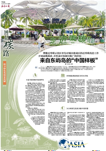 在全球气候变化和碳减排日益受到关注的大环境下,博鳌近零碳示范区创建运行工作的实施和传播,将为全球绿色发展贡献中国智慧。(本报博鳌3月27日电)