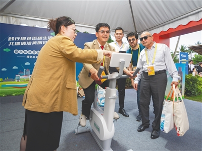 ①与会记者体验单车骑行充电装置。 本报记者 袁琛 摄