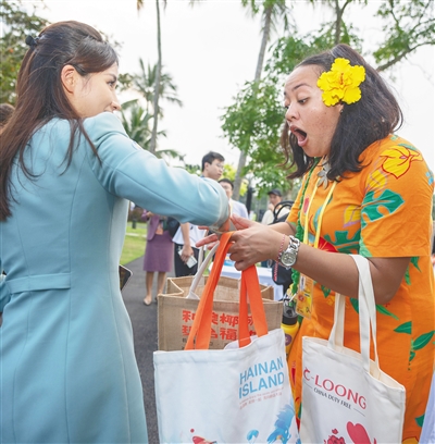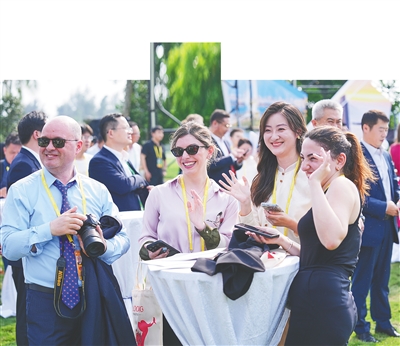 ③外国记者收到主办方送出的伴手礼。本报记者 袁琛 摄