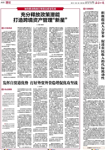 跨境资管业务试点是国家赋予海南的极具含金量的金融政策,可以说是提升海南自贸港金融改革开放水平的“先手棋”。海南自贸港跨境资管业务试点实行单边、主动开放模式,面向全球不限区域,市场更加广阔;扩大境外投资者的境内投资范围,投资产品更加丰富;面向境外所有符合条件的投资者,包括机构和个人,扩展了境外个人投资者直接投资中国市场的通道,投资(发行)主体更加多元。试点的这些优惠政策大大增强了自贸港对境外投资者的吸引力。通过充分释放政策潜能,必将有效促进跨境投融资便利化,推动金融聚焦实体经济,赋能高质量发展。海南自贸港有望通过深入探索与发展跨境资管业务,形成外资进入中国资本市场的独特通道,打造跨境资产与财富管理“新星”,谱写“金融强国”的海南篇章。