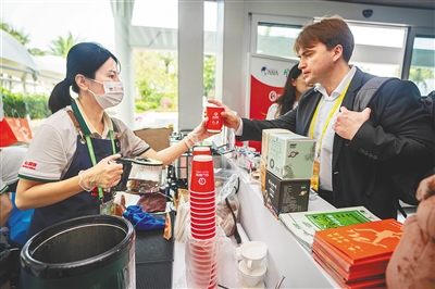 ③ 与会记者在新闻中心品尝“母山”咖啡。