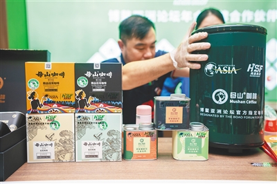 ② 博鳌亚洲论坛会议中心农垦服务台上摆放的“母山”咖啡系列产品。