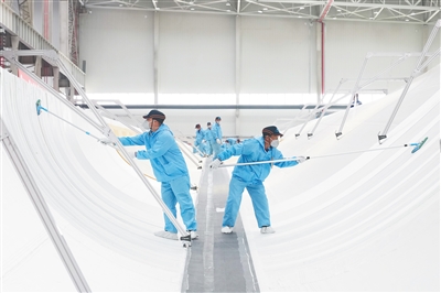 在东方明阳新能源高端装备产业基地,工作人员正在制造MySE292海上超大型叶片。该叶片长143米,叶轮直径达292米,为全球已下线叶轮直径最大的风电叶片。本报记者 武威 摄