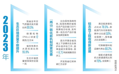 绿色活力持续释放——以争当“双碳”优等生的担当,厚植优势、探路先行,擦亮高质量发展生态底色;成功申报“中国山水工程”项目;出台具有海南特色、陆海统筹的省级生态产品总值(GEP)核算地方标准。