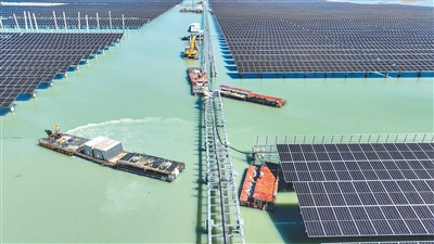 乐东黎族自治县莺歌海,海控能源纳潮湖200MW光伏项目,施工人员在水上进行电缆敷设。本报记者 张茂 摄