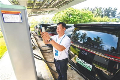 博鳌近零碳示范区,工作人员为电车充电。 本报记者 袁琛 摄