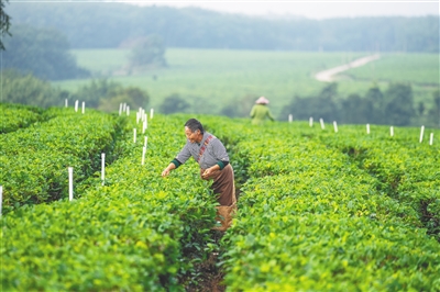 在白沙黎族自治县原生态茶园小镇,农户们在采摘早春茶。白沙是海南首个县域“两山”基地,着力推动茶产业和乡村旅游融合发展。 本报记者 李天平 摄