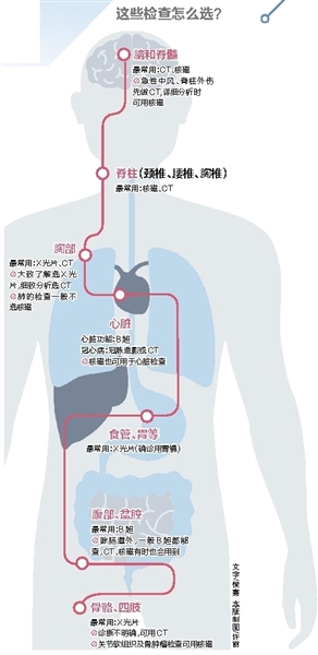 “X光简单、便宜,但是观察不到细节;目前CT在日常检查中应用最普遍,但是有射线;MRI磁共振检查对软组织、脑和脊髓的观察最好,对肺部的检查就不太适合;B超简单易操作,尤其适合表浅器官,如甲状腺、乳腺等部位,但在人体深部时容易受到气体或骨骼的影响;PET-CT贵,射线量比较大,但是看得准看得全。”尹建忠介绍。