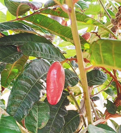 远观,树叶硕大,像一把撑着的巨伞;走近,拨开“伞”叶,才发现树上还结着一颗颗红色的小果实,那就是非洲梅。“这些目前还未成熟,成熟之后果皮颜色为深蓝色和紫色相间,比较有特点。”林樱桃告诉记者。