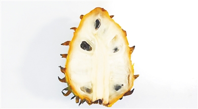 剥去黄龙释迦的外皮,白色的果肉显露出来,散发着清新的香味。取一块,放入口中,慢慢咀嚼,感觉像在吃果冻,软绵绵的,香甜可口。据介绍,黄龙释迦不仅好吃,营养也十分丰富,含有各种矿物质,以及丰富的铁、钙、维生素C和碳水化合物。