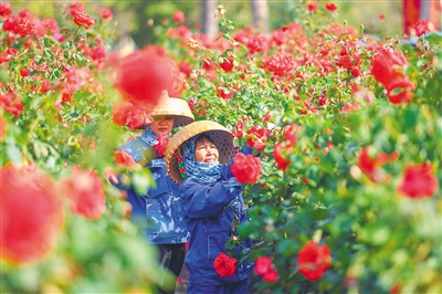 位于三亚博后村的海南玫瑰谷产业发展有限公司种植基地,花农忙着管护鲜花。 (资料图)