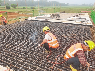 施工人员在绑扎、焊接箱涵钢筋。本报记者 林书喜 通讯员 邱银 摄