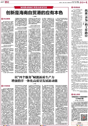 (二)创新驱动是海南自贸港的基因使然。发挥教育、科技、人才的聚合效应,是全球有影响力自贸港的成功之道。海南虽然不是科技大省,但在种业、深海、航天等领域具有独一无二的比较优势。海南虽然不处于国家科创前列,但习近平总书记明确要求海南要加快科技体制机制改革。因此,海南应充分发挥自然资源和区域优势、政策优势、应用场景优势,以吸引高水平科创人才来海南干事创业为导向,以深化科技体制改革、释放科技创新潜能为突破口,以培育壮大新兴产业、前瞻性布局建设未来产业为支撑,不断以科技创新提高我省新质生产力发展水平。
