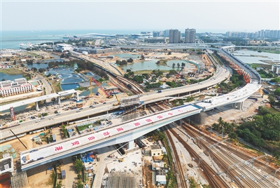 4月3日,海口新海港和南港“二线口岸”(货运)集中查验配套项目(新海港片区“二线口岸”集中查验场所附属专用通道)(涉铁段)转体桥顺利完成转体。该通道起点为集中查验场所,终点为新海港和南港港区,全线高架桥,共计3.2公里。其中,转体部分跨越包括粤海铁路、环岛高铁西段和多条海口站配套股道,转体结构跨度达2×90米,吨位达2.4万吨,为我省现有最大规模跨铁转体桥。据了解,此次完成转体标志着二线口岸货运封关运作项目控制性工程取得突破性进展,将为“二线口岸”集中查验场所运行压力测试和封关运作夯实坚强的基础。