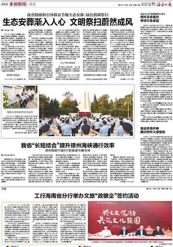 又是一年春草绿,又到一年清明时。清明节前夕,海南日报记者在海口、文昌、三亚等地走访发现,我省各地都在鼓励和引导群众文明节俭治丧、节地生态安葬、绿色低碳祭扫,大力营造文明丧葬新风。